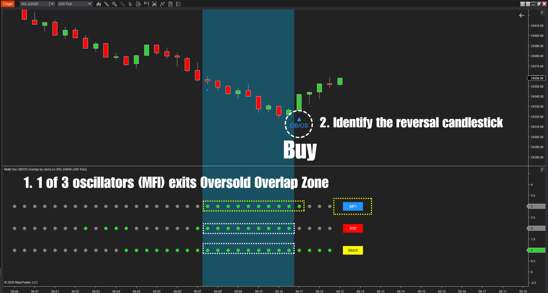 1. Overlap detection: All 3 oscillators must enter the user-defined OB/OS thresholds simultaneously, creating an “Overlap Zone”.